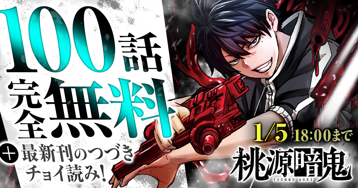 桃源暗鬼・第1話桃源暗鬼・第1話 日本人なら誰もが知ってる「桃太郎」の昔話。もし、桃太郎が悪だったら? 「桃太郎」の世界観を鬼側の視点から描いた新世代ダークヒーロー鬼譚! 主人公・一ノ瀬四季はある日突然「桃太郎機関」に所属する謎の男に襲われる。 血の繋がらない父親と一緒に逃亡する途中、追っ手がおとぎ話に登場する桃太郎の血を継いでいること、そして自分が「鬼の血」を継いでいる事実を知ることに。 何千年と続く桃太郎と鬼の血みどろの抗争。正義とされる桃太郎は本当に正義なのか、鬼は悪者でしかないのか──。